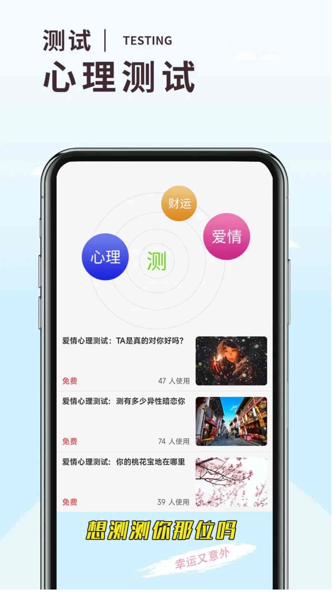 2、測試:你的桃花寶地在哪里、你在感情中是哪種人、探測你的心機、哪類女孩是你的情敵、Ta是真的對你好嗎、有多少異性暗戀你...