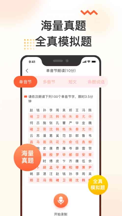 3、專項(xiàng)練習(xí),提供全面的聲母、韻母、聲調(diào)、單音節(jié)字、多音節(jié)詞、短文朗讀等練習(xí),薄弱環(huán)節(jié)針對性練習(xí),讓考試成績更優(yōu)。