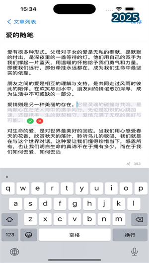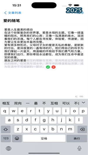 寫作補全APP內(nèi)置創(chuàng)作激勵系統(tǒng),用戶可以通過創(chuàng)作活躍度記錄和連續(xù)創(chuàng)作天數(shù)展示,保持持續(xù)的創(chuàng)作動力。通過月度寫作數(shù)據(jù)追蹤和激勵反饋工具,用戶可以實時了解自己的寫作進度,并根據(jù)數(shù)據(jù)調(diào)整創(chuàng)作計劃。無論是日常寫作,還是長期創(chuàng)作計劃,寫作補全APP都能提供最全面的激勵支持。