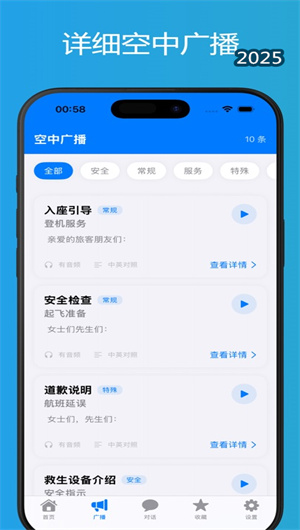 1. 標(biāo)準(zhǔn)廣播訓(xùn)練系統(tǒng):空乘口語APP的廣播詞庫完整收錄起飛、降落、顛簸等各類客艙廣播場景,每段廣播均提供原聲示范和文本對照。跟讀評分功能實時分析發(fā)音準(zhǔn)確度,語速調(diào)節(jié)支持0.5-1.5倍速練習(xí),重難點標(biāo)記幫助針對性突破,全方位提升用戶的廣播播報能力。