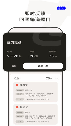 詞變App提供分類練習模式,用戶可針對て形、た形、ない形等9種標準變形進行專項訓練。系統采用漸進式難度設計,從規則動詞到不規則動詞逐步進階。每道題目完成后立即顯示正確答案對照和變形規則解析,幫助用戶即時鞏固知識點。獨特的發音標注功能同步展示變形后的羅馬音讀法,強化聽說讀寫全方位記憶。