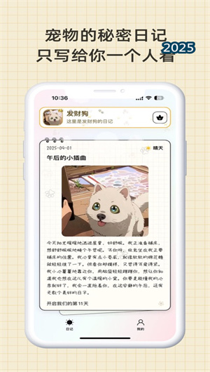 2. 日記生成系統(tǒng):基于自然語(yǔ)言生成技術(shù)與情感計(jì)算模型,專(zhuān)屬萌寵每日自動(dòng)生成手寫(xiě)風(fēng)格的暖心日記,細(xì)膩記錄與用戶的互動(dòng)點(diǎn)滴。日記內(nèi)容涵蓋清晨撒嬌、午后慵懶、夜晚陪伴等多樣化場(chǎng)景,系統(tǒng)通過(guò)情感語(yǔ)義分析捕捉用戶互動(dòng)時(shí)的情緒波動(dòng),并將其轉(zhuǎn)化為寵物視角的溫暖文字,使每篇日記都充滿個(gè)性化治愈感,增強(qiáng)情感連接的深度與真實(shí)度。