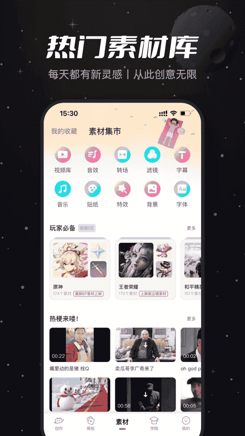 2、熱門素材庫,每天都有新靈感,從此創意無限,模板中心,豐富的模板創作,一鍵就能生成熱門大片。